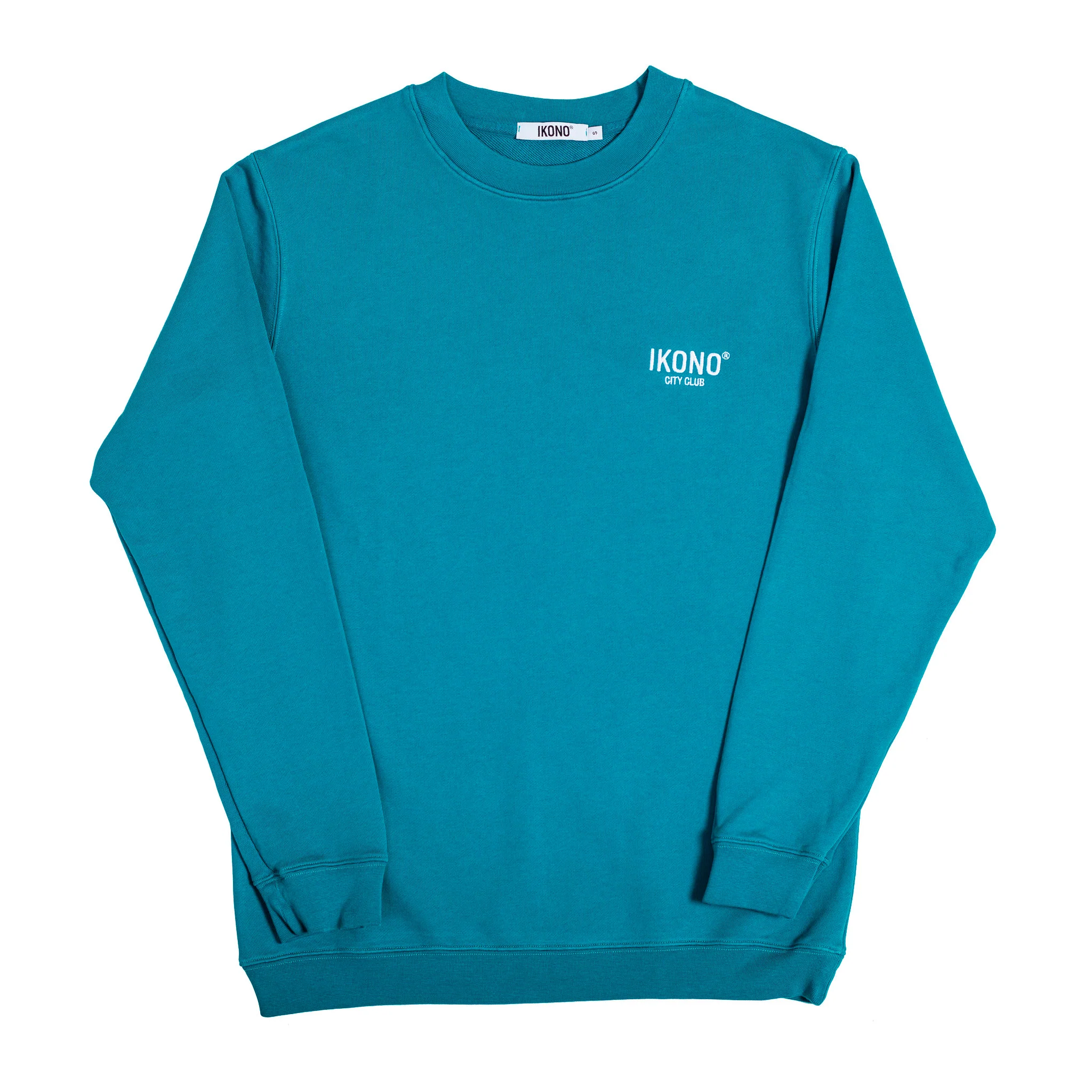 Emerald green unisex sweater with "IKONO® CITY CLUB" embroidery on the left chest. Sizes run large, scale down 1 size for a tighter fit.Â