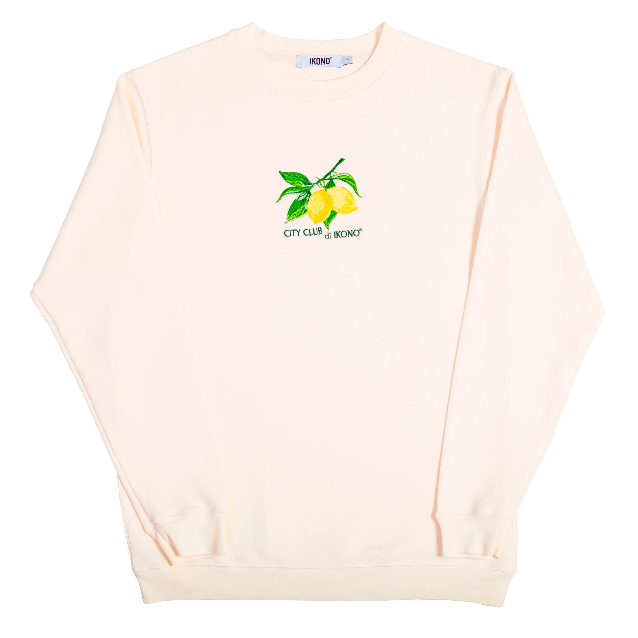 Vanilla Unisex Sweater with lemon embroidery on the middle chest. Sizes run large, scale down 1 size for a tighter fit.